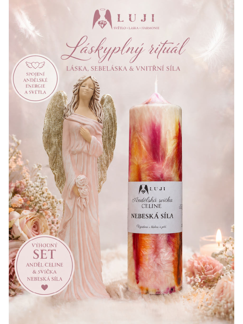 Tento láskyplný set propojuje něžnou energii anděla Celine s andělskou svíčkou „Nebeská síla“. Společně vytváří harmonický rituál, který tě podpoří v sebelásce, vnitřní rovnováze a důvěře v sebe sama.