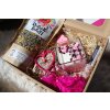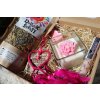 Dárkový box obsahuje sójovou svíčku dle vašeho výběru, čajovou svíčku s vůní gin and tonic, čaj Doušek štěstí (duševní pohoda, rovnováha, klid, relaxace...), lapač snů ve tvaru srdce (ručně vyrobený na Bali) a také náhodnou koupelovou sůl v ampuli.