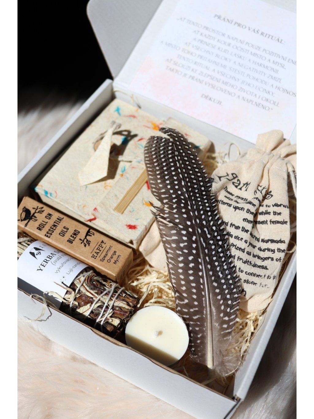 Uvnitř najdete pečlivě vybrané prvky, které vám pomohou vytvořit si vlastní malý rituál – bezpečný prostor, kde můžete nechat odejít napětí, zpomalit a vnímat, co vám vaše mysl a srdce chtějí říct.