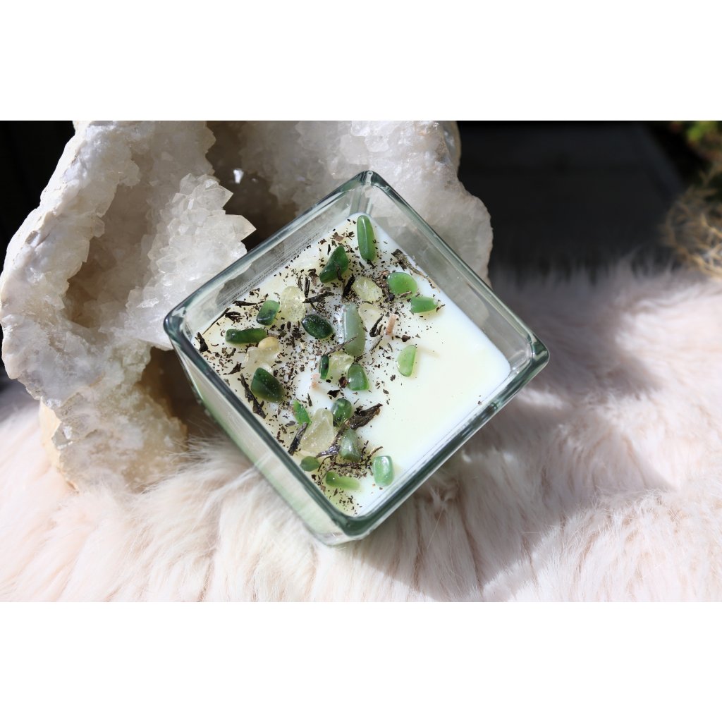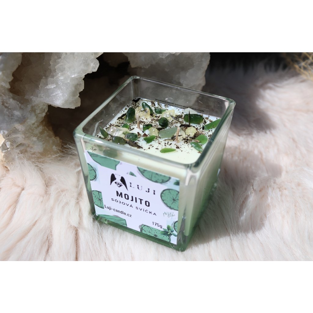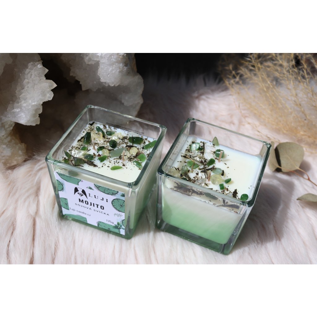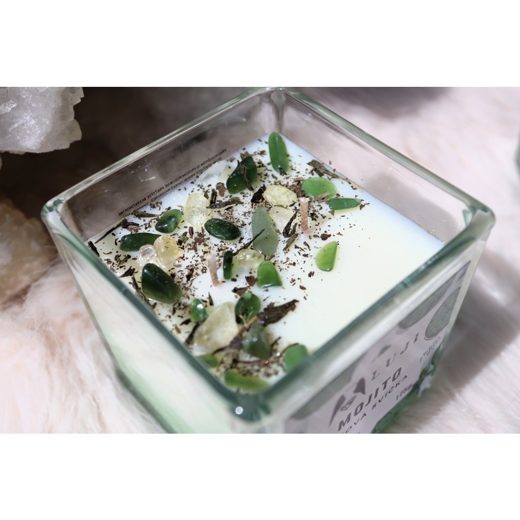 Vůně limetky, máty a třtinového cukru vytváří nezaměnitelné aroma oblíbeného koktejlu, které vás přenese na terasu pod palmami. Vůni doplňuje sušená máta jako jemný detail přírody a krása nefritu a citrínu, které svíčku nejen zdobí, ale zároveň nesou svůj energetický záměr.